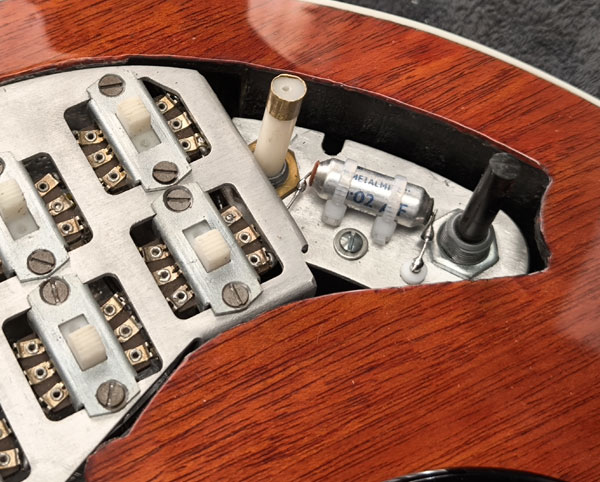 | Pastillas | B&B bobinadas a mano y con especificaciones originales. Pastilla de mástil con base en epoxy. Pastilla media con imanes invertidos. Acabado Relic |